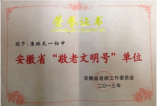 天一初中在注重教育教學的同學,把敬老文明號的創(chuàng)建與精神文明建設相結合,與學雷鋒、樹新風活動相結合,在校內外的社會實踐活動中,大力開展敬老、愛老的各種宣傳,把尊老、敬老、愛老的傳統(tǒng)美德,通過老師、學生去感染自己身邊的人,逐漸形成全社會都關心、關愛老年人的良好社會風氣。通過一年來的尊老,助老主題活動的開展,2013年12月,淮北市天一初中分別被國家老齡工作委員會及安徽省老齡工作委員會評為“敬老文明號單位”榮譽稱號。2013年12月24日,安徽衛(wèi)視對淮北市天一初中獲得2013年全國“敬老文明號”先進單位還進行了專題報道。