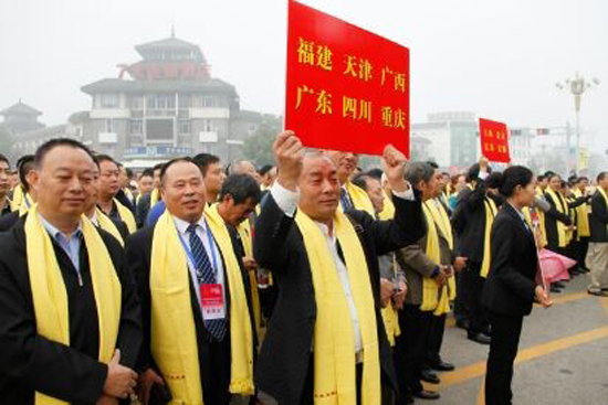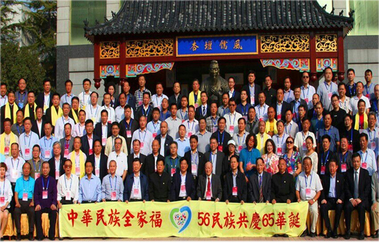 孔氏家族無疑是“中華第一大家庭”。參加家祭的孔子后裔們配合中國少數(shù)民族文化藝術(shù)促進會《中華民族全家福》組委會拍下這張史上最大的民族全家福(漢族?局部),向新中國65華誕獻禮。(前排配合扯橫幅的人中,56數(shù)字之后是世界孔子后裔聯(lián)誼總會會長、孔子世家譜常態(tài)化續(xù)修工作協(xié)會榮譽會長