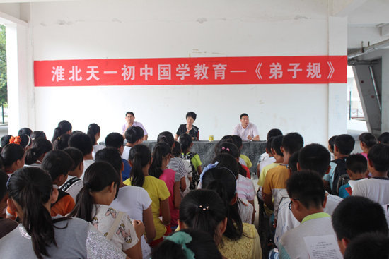 天一初中負責人郭光梅給學生講授《弟子規(guī)》,對學生文明禮儀、傳統(tǒng)美德、行為習慣、校規(guī)校紀進行了品德教育。天一初中一直把傳統(tǒng)教育和新形勢下教育理念相結合,在七年級新生即將進入中學階段學習之際,天一初中狠抓國學教育不放松,打好學生良好美德底色。淮北市天一初中是淮北市孝文化研究會實驗基地,一直以來,該校將對師生進行的《弟子規(guī)》《新24孝》教育與創(chuàng)建文明校園、精致校園緊密結合,取得了顯著成效。該校大力開展孝文化國學教育主題教育宣傳實踐活動,營造濃厚的孝老愛親文化氛圍。在校領導班子中,把孝老愛老作為加強自身建設的重要內(nèi)容和行為準則,要做孝老愛親的模范;在教職工中,除做到為人表率外,要做到每月看望一次老人,每半年給雙方老人添衣物、鞋襪等,半年陪老人做一次體檢,一年給老人安排一次旅游;在學生中開展孝文化教育實踐活動,要求學生經(jīng)常向父母和老人問好,每周做一次家務,每學期給父母寫一封感恩的信,每半年和父母或老人讀一本孝老愛親的圖書,把父母的生日和老年節(jié)定為感恩節(jié),經(jīng)常做一些力所能及的家務和公益活動。同時,對學生進行老年人權益保障法普及、古今孝道事例宣講等形式多樣的孝文化教育,并廣泛動員全體師生做孝文化的踐行者、傳播者、志愿者。