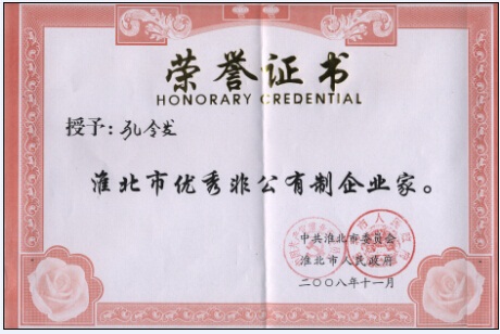2008年孔令董事長獲評淮北市優(yōu)秀非公有制企業(yè)家