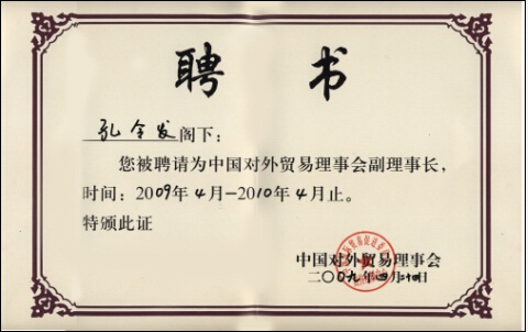 2009年孔董事長榮聘為中國對外貿易理事副理事長